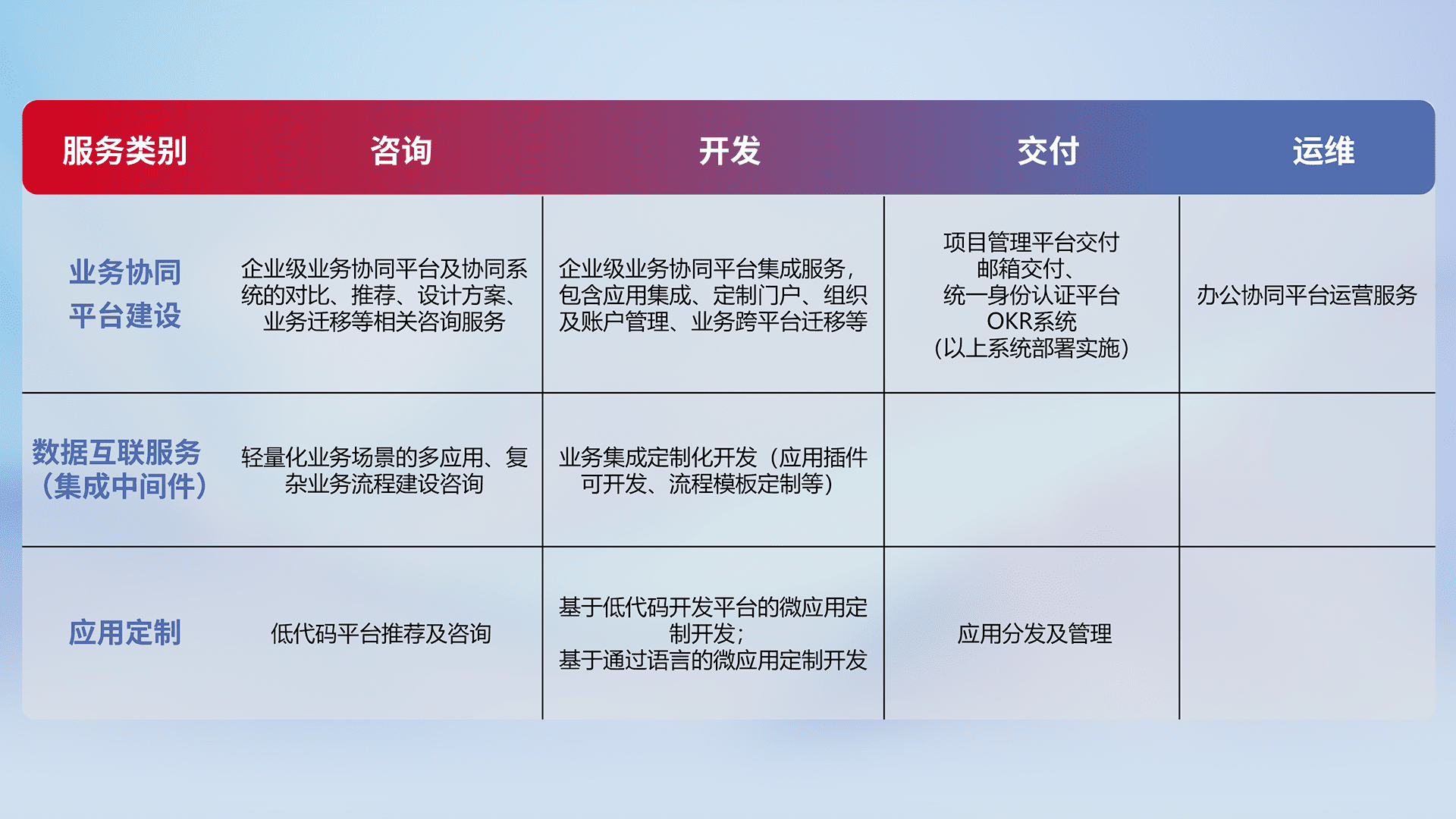 针对钉钉、、、企微、、IDaas等平台级产品提供产品的规划、、方案、、、交付、、定制化开发等服务,,,,实现如统一协同办公、、智能客户服务、、、、混合会议管理、、智能数据查询、、、、等业务场景,,实现数字化转型。。。