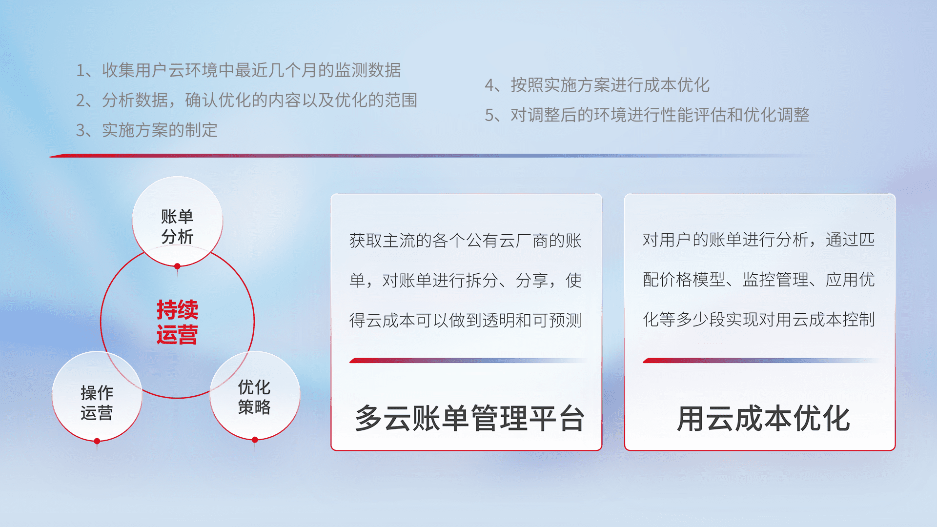 通过多云纳管,,,以统一的资源数据模型把客户的云资源进行抽象和封装,,进而实现对多云资源的统一操作,,保障云资源管理的可靠性、、稳定性与可用性。。量身定制化运维内容,,配置、、、、开发运维、、、、补丁管理、、、备份、、监控、、、、认证和访问管理、、、审计和日常巡检等,,,,保障在用云过程中的可靠度,,,,稳定度以及高可用率。。
