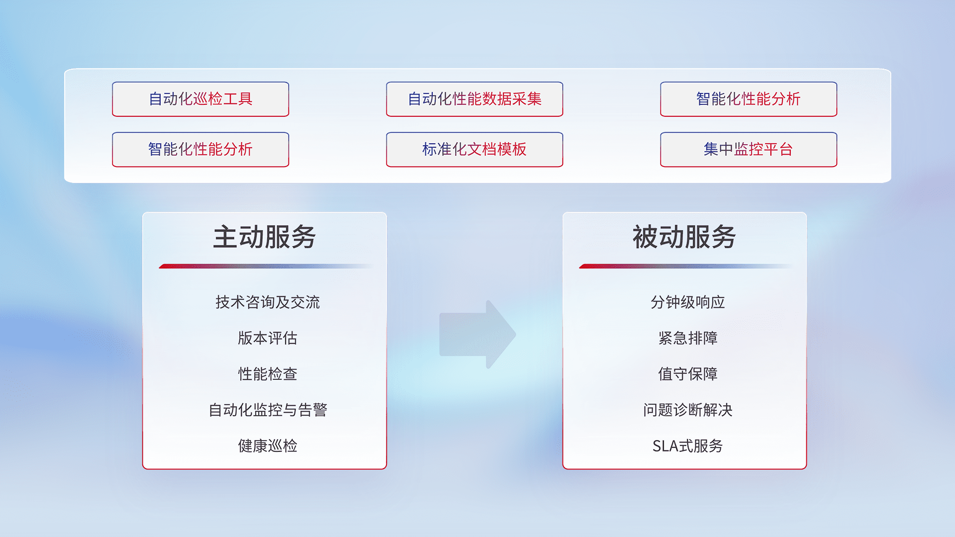 智能化工具和标准化文档,,,,保障服务质量,,,提供主动服务(包含技术咨询、、、、版本评估、、、、性能检查、、自动化监控与告警、、、、健康巡检)和被动服务包含(分钟级响应、、、紧急排障、、、值守保障、、问题诊断解决、、、SLA服务)。。。